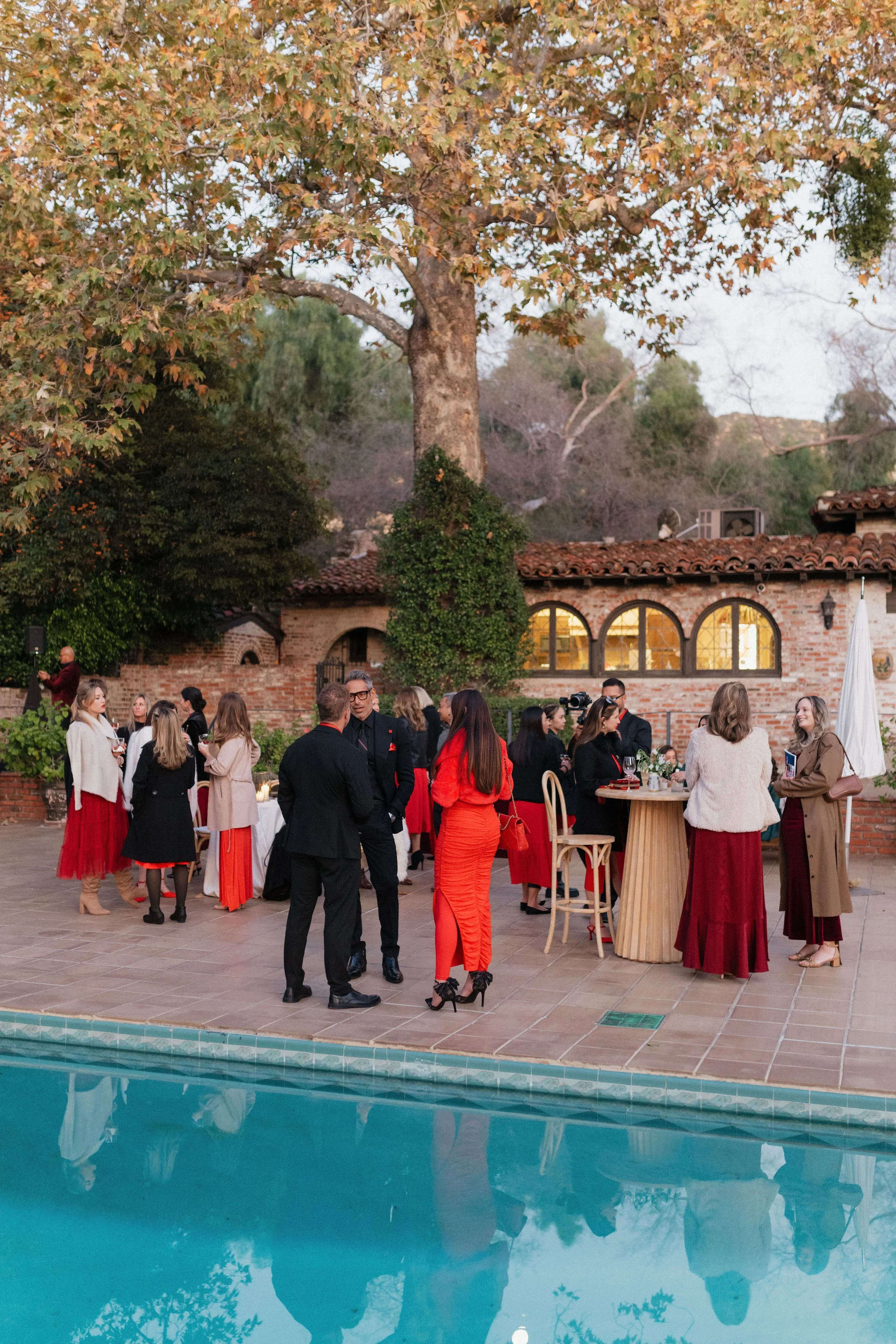 California Wedding Day gathered the wedding vendor community to Hummingbird Nest Ranch to celebrate the launch of its Spring/Summer 2026 issue, set against a richly styled Winter Solstice theme. Planned and designed by Events by Fran, the event featured a red-hued cocktail dress code and effortlessly blended old-Hollywood glamour with the property’s European architecture and garden courtyards.